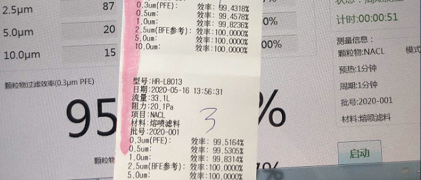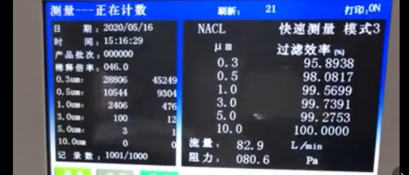 一般情況下熔噴布做檢測報告的話一般會做阻力測試、過濾效率測試、微生物檢測等幾個項目。(上圖為徐州國宏包裝有限公司的熔噴布檢測展示圖。)過程中會用不同規(guī)格大小的微粒子向熔噴布施壓來檢測產(chǎn)品的過濾效果。前面0.3μm、0.5μm就是攻擊測試微粒子的大小,后面的數(shù)據(jù)就是過濾效率。