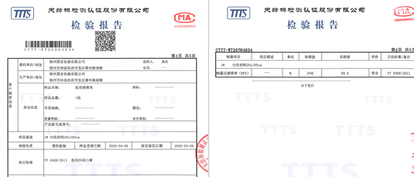 我司徐州國宏包裝有限公司熔噴布的檢測報告為:BFE>=99%,PFE>=95%.